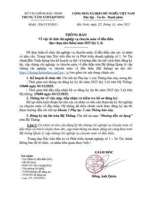 Trung tâm Xúc tiến đầu từ và Phát triển doanh nghiệp số 1 – Sở Tài chính Bắc Ninh trân trọng thông báo về việc tổ chức thi nghiệp vụ chuyên môn về đấu thầu (lựa chọn nhà thầu) năm 2025 (kỳ 3,4)
